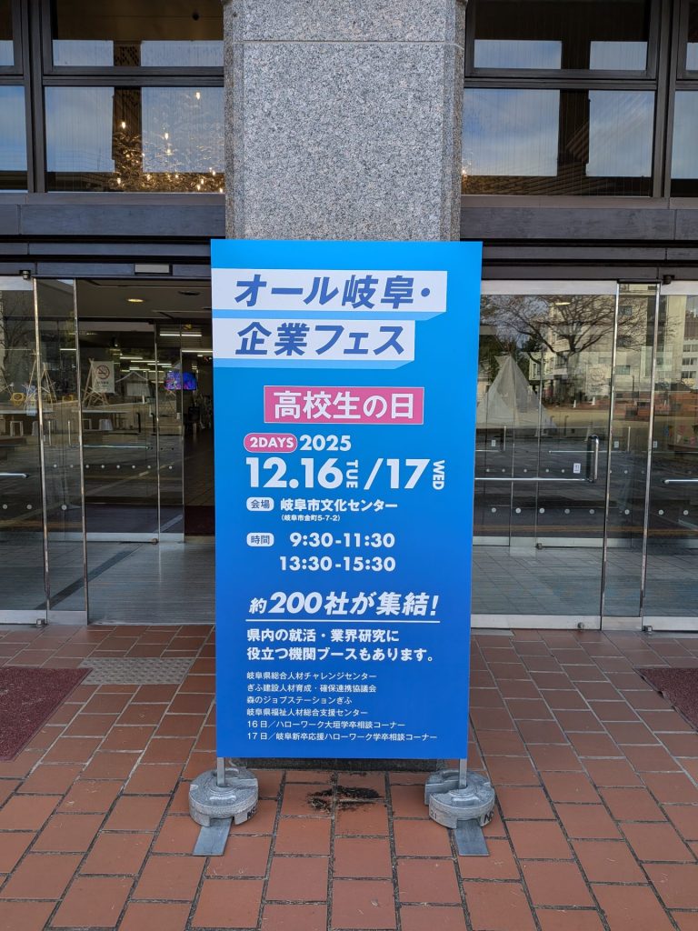 令和7年12月16日(火)、17日(水)の2日間にわたり、岐阜市文化センター1階 催し広場で開催された「オール岐阜・企業フェス 高校生の日」に、私たち森のジョブステーションぎふ(通称:森ジョブ)が出展しました。