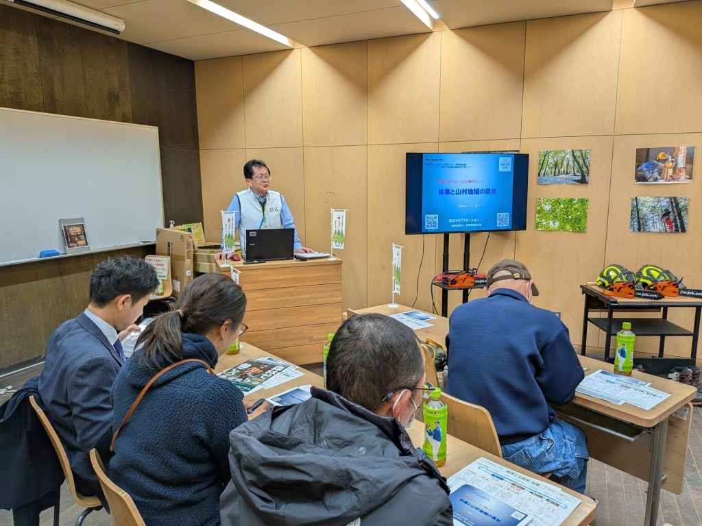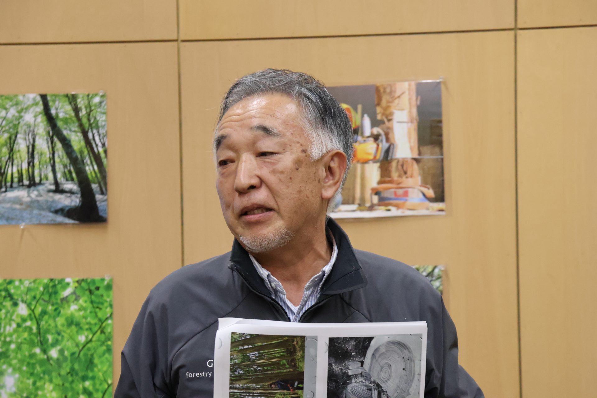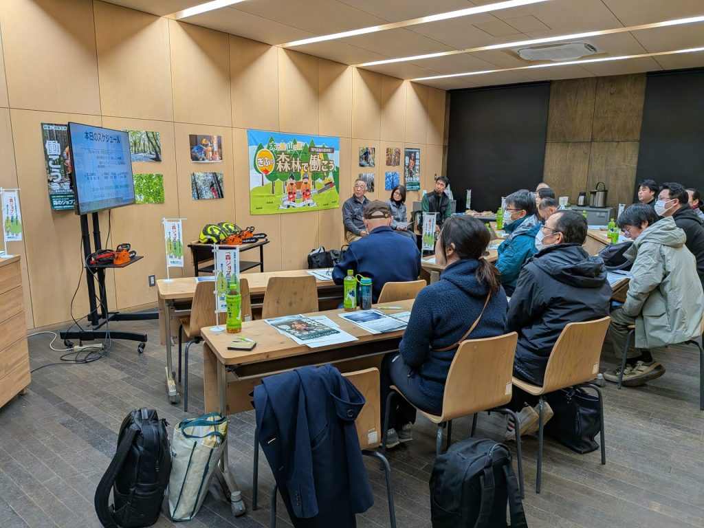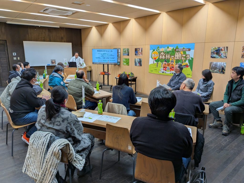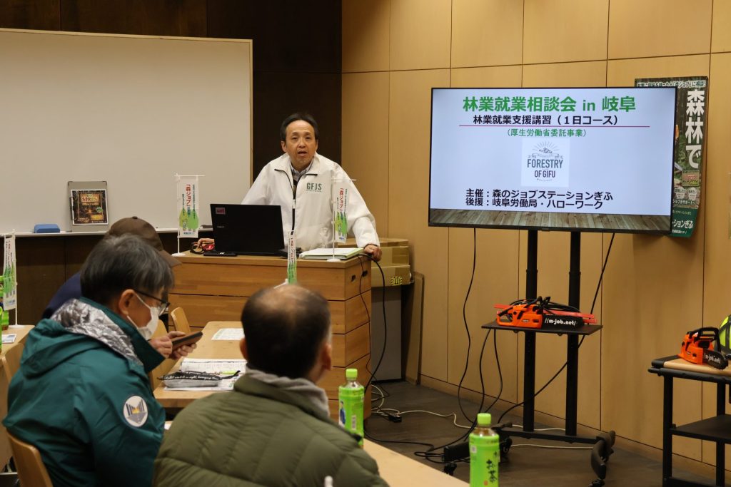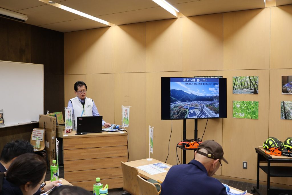 森ジョブの野田事務局長と長谷部課長から、林業の仕事内容、ぎふ林業について、1日の流れといった、林業の基礎的な説明がありました。