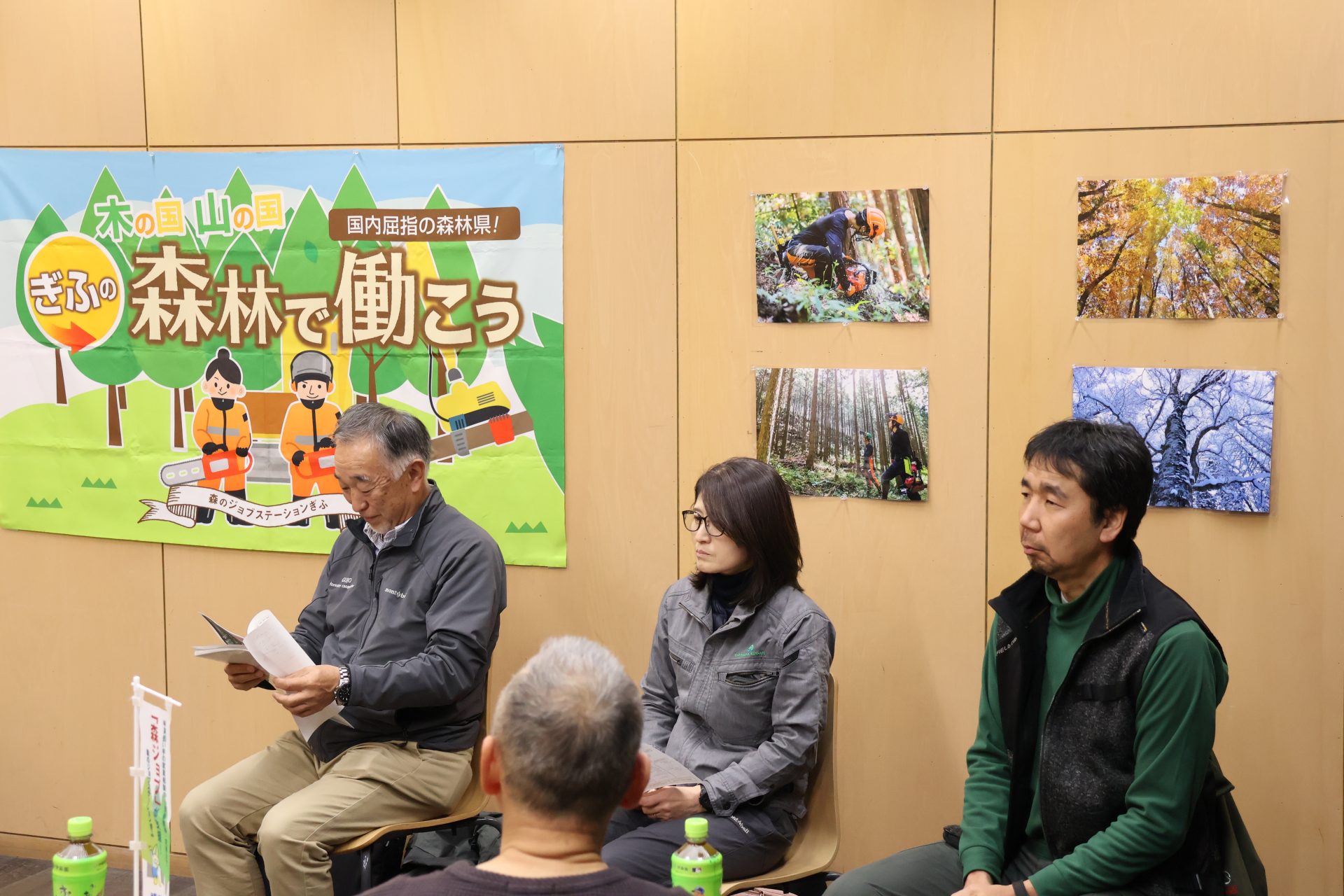 続く森林技術者トークセッションでは、実際に林業の現場に立つ郡上森林組合の樋口さん、有限会社大原林産の取締役大西さん、加子母森林組合の小林さんがマイクを握りました。