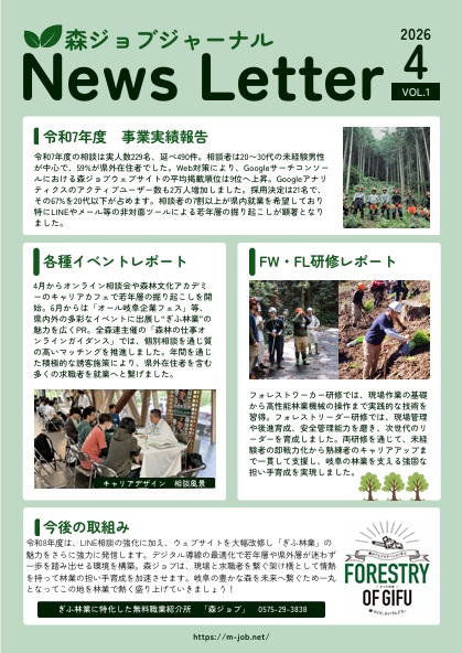 森ジョブ「ニュースレター」を発行しました 読み物 2026.04.13 毎年8月に発行しておりました「森ジョブジャーナル」ですが、今年度からは「ニュースレター」として年に数回ウェブサイト上で情報を公開する運びとなりました。 第1号は、令和7年度の事業実績報告等を掲載しております。 ぜひご覧ください。 各種資料 一覧へ戻る 前の記事