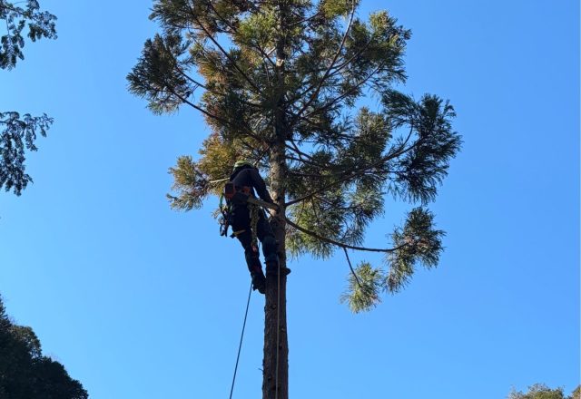 そのまま伐採できない木は、ツリークライミング技術を使い、安全に確実に伐採します。とてもやりがいのある仕事の一つです。