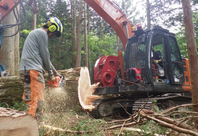 木材生産の現場スタッフ・・・・森林での伐採・集材・運搬を行い、丸太を出荷できる状態に仕上げる仕事です。チェーンソーや重機を使い、安全に木を伐り、集め、運び出します。未経験の方も、基礎から技術を身につけながら働けます。