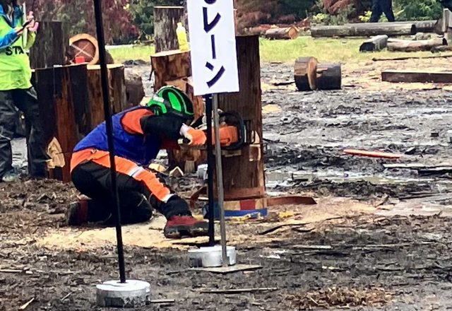 岐阜県伐木安全技術評価会2025に当社職員が選手として参加しました。見事おじさん2名が2位と3位に入賞しました。写真は2位の「グリーンおじさん」です。