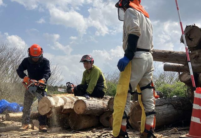初心者に対する研修。山に行く前にチェンソー操作の練習を行います。スライス切り、模擬伐倒練習などを連日行う苦行を味わいます。
