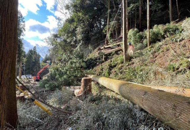 【森林伐採】高性能林業機械を操作して伐倒方向を自在にコントロール。安全に作業を進めます。