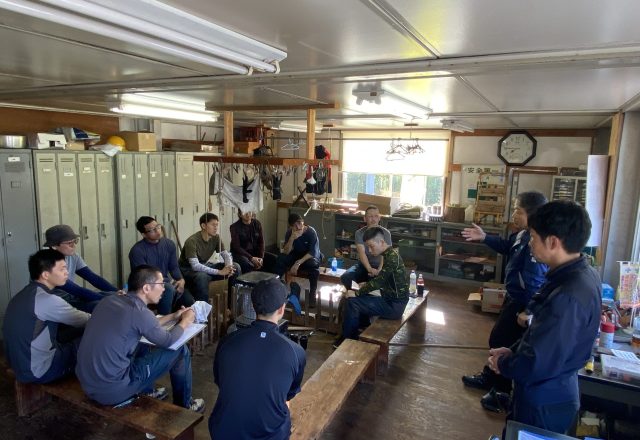森林作業の安全ミーティングの様子。作業前には危険箇所や作業手順を確認し、安全第一で現場作業を行っています。