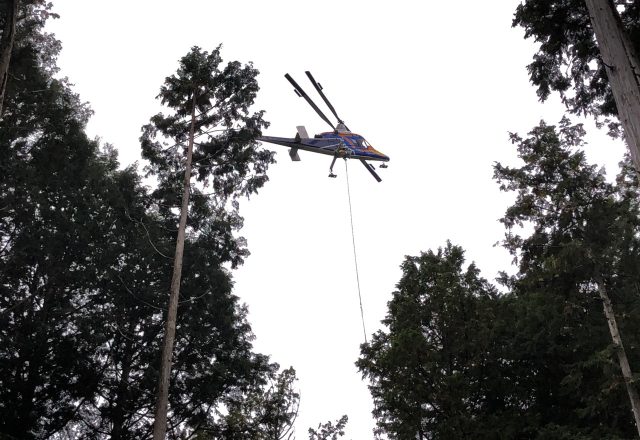 ヘリコプターを使った木材搬出作業(ヘリ集材)。山奥の現場でも効率よく木材を運び出す、迫力のある作業です。