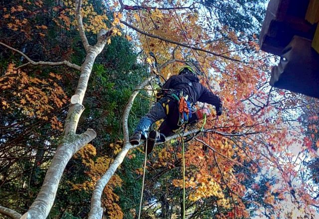 住宅地や道路沿いなどで行う特殊伐採作業。高度な技術と安全管理が求められる専門的な仕事です。